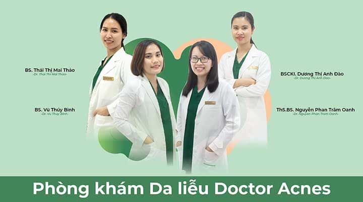 Đội ngũ Bác sĩ Da liễu tại Phòng khám Doctor Acnes bao gồm: ThS.BS. Nguyễn Phan Trâm Oanh, BSCKI Da liễu Dương Thị Anh Đào, BS. Vũ Thúy Bình và BS. Thái Thị Mai Thảo. Các Bác sĩ Da liễu tại Phòng khám Doctor Acnes đều có chứng chỉ hành nghề Da liễu và có kinh nghiệm nhiều năm trong lĩnh vực điều trị mụn và sẹo mụn. Với các ca khó, các Bác sĩ tại Phòng khám sẽ hội chẩn để tối ưu hóa liệu trình điều trị cho bệnh nhân. Bên cạnh đó, Phòng khám còn có đội ngũ Dược sĩ Đại học chuyên sâu về dược mỹ phẩm, đảm bảo tư vấn đúng công dụng và cách sử dụng từng loại sản phẩm chăm sóc da cho khách hàng.